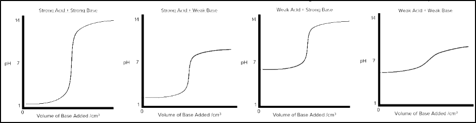 When a base is added to a solution of an acid, the H+ ions will be slowly neutralised by the HO ions of the base. Hence, there is a steady decrease in the H+ ion concentration and pH value increases uniformly. At the end point there is a steep rise in the pH value. The pH values can be plotted against the volume of the base added and the curve so obtained is called titration curve. These curves are useful in the choice of a suitable indicator in an acid-base titration. A suitable indicator in an acid-base titration is one whose range is well within the sharp rising portion of the titration curve that is around the equivalence point. Thus the choice of a suitable indicator for any titration depends on the nature of the acid and base involved and the working range of the indicator.Titration of a strong acid against a strong base: (Example: HCl vs NaOH)In this type of titration, the change in the pH value at the end point is roughly from 4 to 10. Therefore any indicator which changes its colour within this range may be used as a suitable indicator in the titration of strong acid against strong base. Any indicator out of methyl orange, methyl red, phenolphthalein or bromothymol blue can be used to determine the endpoint.Titration of strong acid against weak base : (Example: HCl vs NH4OH)When a strong acid like HCl is titrated against a weak base like NH4OH, the pH changes from 3.5 – 6.5 at the end point. The best indicator for this type of titration is methyl orange which changes its colour within this pH range.Titration of a weak acid against a strong base: (Example: CH3COOH vs NaOH)When a weak acid like CH3COOH is titrated against a strong base like NaOH, the pH value changes from 6.5 - 10. Thus phenolphthalein is the suitable indicator for this titration as its working range is 8.3 - 10. Titration of weak acid against weak base: (Example: CH3COOH vs NH4OH)In this type of titration there is no sharp change in the pH value at the end point. Therefore, in the titration of a weak acid against a weak base none of the indicators shown in the table are quite satisfactory.