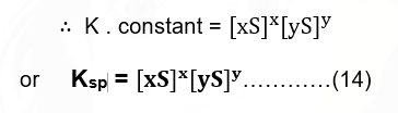 The salt AxBy dissociates to produce x number of cations Am+ and y number of anions Bn-. If the molar solubility of AxBy is S, then it can be seen from the stoichiometry of the salt that[Am+] = xS and [Bn-] = ySEquation (13) can be written as