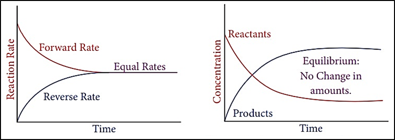 7.3.2 Characteristics of Chemical EquilibriumThe system must be closed, meaning no substances can enter or leave the system.Even though we don’t necessarily see the reactions, both the forward and reverse reactions are taking place. Thus chemical equilibrium is dynamic in nature.The amount of reactants and products do not have to be equal. However, after equilibrium is attained, the amounts of reactants and products will be constant (equilibrium concentrations).At equilibrium, the rate of the forward reaction is equal to the rate of the backward reaction.At the chemical equilibrium, the observable properties of the system like pressure, colour, concentrations, etc. become constant and remain unchanged thereafter.The equilibrium can be approached from either direction.State of chemical equilibrium is unaffected by catalyst because the presence of catalyst equally increases the speed of both the forward and the backward reaction.State of chemical equilibrium changes with the change in factors like concentration, temperature and pressure.7.4 Law of Chemical equilibrium The mixture of reactants and products formed at the chemical equilibrium state is called equilibrium mixture. The concentrations of the reactants and products in a chemical equilibrium state for a reversible reaction are called equilibrium concentrations. Now, a number of important questions about the composition of equilibrium mixtures may arise such as: What is the relationship between the concentrations of reactants and products in an equilibrium mixture? How to determine equilibrium concentrations from initial concentrations? What factors can be used to alter the composition of an equilibrium mixture? The last question is relevant while choosing conditions for synthesis of industrial chemicals such as H2, NH3, CaO, etc. as high yields of these chemicals are expected.In 1864, Cato Maximilian Guldberg and Peter Waage formulated the law of mass action, based on the experimental studies of several reversible reactions. The law states that, “At any instant, the rate of a chemical reaction at a given temperature is directly proportional to the product of the active masses of the reactants at that instant”. Here, active mass is molar concentration per unit volume of that substance.Rate ∝ [Reactant]xHere, x is the stoichiometric coefficient of the reactant and the square bracket represents the active mass or concentration of the reactants.Concentration = n/VHere, n is the number of moles and V is the volume of the container in dm3 or L.7.4.1 Equilibrium constant (Kc and Kp)Let us consider a reversible reaction,aA + bB ⇌ cC + dDHere, A and B are the reactants, C and D are the products. a, b, c and d are the stoichiometric coefficients of A, B, C and D, respectively. Applying the law of mass action, the rate of the forward reaction,rf ∝ [A]a [B]bor rf = kf [A]a [B]b kf = rate constantSimilarly, the rate of the backward reaction,rb ∝ [C]c[D]dor rb = kb [C]c[D]d kb = rate constantAt equilibrium,Rate of forward reaction (rf) = Rate of backward reaction (rb)kf [A]a [B]b = kb [C]c [D]dkf