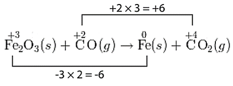 The carbon atom’s oxidation number increases by 2, while the iron atom’s oxidation number decreases by 3. As written, the number of electrons lost does not equal the number of electrons gained but in a balanced redox equation, these must be equal.Step III: Use coefficients to make the total increase in oxidation number equal to the total decrease in oxidation number. In this case, the least common multiple of 2 and 3 is 6. So the oxidation-number increase should be multiplied by 3, while the oxidation-number decrease should be multiplied by 2.