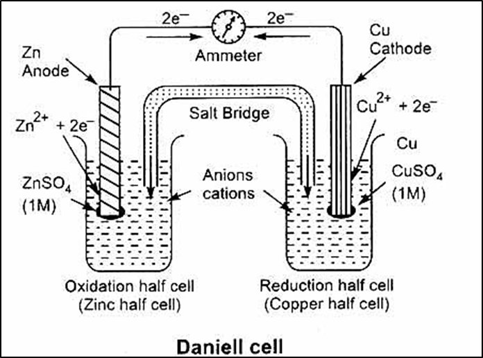 It indicates that between copper and silver, copper has the tendency to release electrons and silver to accept electrons.From the above two experimental observations, we can conclude that among the three metals, namely, zinc, copper and silver, the electron releasing tendency is in the following order: Zn > Cu > Ag. In practice, the list of order of reducing tendency is extended as a metal activity series or electrochemical series. This kind of competition for electrons release among various metals helps us to design galvanic cells in which the chemical reactions (chemical energy) become the source of electrical energy. 8.9 Redox reactions and Electrode processesThe reaction between Zn strip in copper sulfate solution (vide supra 8.8) can be designed in such a way that electrons are transferred indirectly which necessitates the separation of zinc metal from copper sulfate solution. The whole set up is done in voltaic cell or galvanic cell where chemical energy is converted to electrical energy. For this particular reaction as mentioned above the cell is known as Daniell cell which is one of the types of voltaic cell/galvanic cell.The cell consists of two separate compartments called half-cell. A half-cell is one part of a voltaic cell in which either the oxidation or reduction half-reaction takes place. The left half-cell is a strip of Zn metal in ZnSO4 solution. The right half-cell is a strip of Cu metal in CuSO4 solution. The strips of metal are called electrodes that are conductors in a circuit that is used to carry electrons to the solution part of the circuit. Now, in both the compartments reaction takes place at the interface of the metal and its salt solution where reduced and oxidized forms of the same species are present. A redox couple is having together the oxidised and reduced forms of the same substance taking part in an oxidation or reduction half reaction. In this experiment the two redox couples are represented as Zn2+/Zn and Cu2+/Cu. By convention, oxidized forms are written before the reduced forms.The solutions in two compartments are connected by a salt bridge (a U shaped tube containing a solution of strong electrolyte like KCl, NH4NO3 etc. usually solidified by boiling with agar agar and later cooling to a jelly like substance). This provides an electric contact between the two solutions without allowing them to mix with each other. The two electrodes are connected by a metallic wire able to conduct electrons with a provision for an ammeter and a switch. The switch opens or closes the circuit.