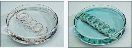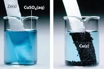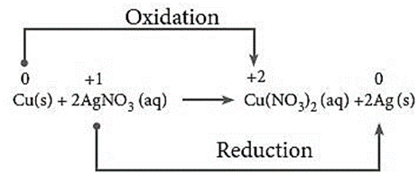 Zn(s) + Cu2+ (aq) → Zn2+ (aq) + Cu(s)Zn is oxidized by Cu2+ to Zn2+ and Cu2+ ion is reduced by gaining electrons from the Zn. However, if we place a metallic copper strip in zinc sulphate solution, the reverse reaction does not occur. Therefore, we conclude that among zinc and copper, zinc has more tendency to release electrons and copper to accept the electrons.Let us extend the reaction to copper metal and silver nitrate solution. If we place copper wire in sliver nitrate solution, after some time, the solution slowly turns blue. This is due to the formation of Cu2+ ions, i.e. copper replaces silver from silver nitrate. The reaction is,
