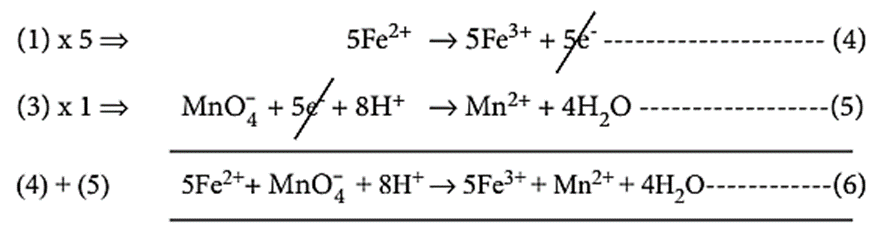 Step II: Separate the equation into half-reactions: oxidation and reduction.Oxidation: Fe2+ → Fe3+ + 1e- -------------------- (1)Reduction: MnO4− + 5e- → Mn2+ -------------------- (2)Step III: Balance the atoms other than O and H in each half reaction individually. Here the oxidation and reduction half reactions are already balanced with respect to Fe and Mn atoms. Step IV: Balance the O and H atoms. For equation (2), 4 ’O’ atoms are on the reactant side, therefore add 4H2O on the product side and then to balance ’H’ - add, 8H+ in the reactant side.MnO4- + 5e- + 8H+ → Mn2+ + 4H2O ---------------- (3)Check whether charges are same on both sides of the two equations. Here, for equations (1) and (2), charges are same on both sides.Step IV: Equate both half reactions in such a way that the number of electrons lost is equal to the number of electrons gained and that can be done by multiplying equation (1) by 5 and equation (3) by 1. Addition of two half reactions (equations 4 and 5) gives the balanced equation represented by equation (6).