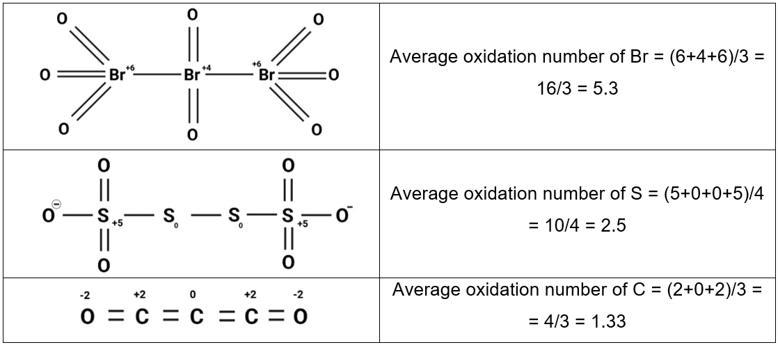 In this reaction, Mn7+ in potassium permanganate (KMnO4) oxidizes Fe2+ present in ferrous sulfate (FeSO4) into Fe3+ present in ferric sulfate {Fe2(SO4)3} by gaining electrons and thereby itself gets reduced to Mn2+. Such reagents are called oxidizing agents or oxidants. In another way it can be said that Fe2+ reduces Mn7+ by giving electrons and thereby itself gets oxidized to Fe3+. Such reagents are called reducing agents or reductants. In this reaction, except Mn and Fe, oxidation numbers of atoms of all other elements are intact before and after the reaction.8.4.3 Fractional Oxidation NumberIn certain compounds, while calculating the oxidation number of a particular element following the rules as mentioned early (vide supra 8.4), we can get fraction values. Some examples are Br3O8 where oxidation number of Br is 16/3 Na2S4O6 where oxidation number of S is 5/2 C3O2 where oxidation number of C is 4/3Since the numbers of electrons are whole numbers, the oxidation number of individual atoms should be a whole integer. In these examples, if we see the actual structure with proper bonding, it is found that the atom for which we are calculating oxidation number is present with different oxidation states at different positions and hence has to be, calculated individually; taking into consideration the atoms to which it is bonded. Calculation of the oxidation state of the atom using the normal method assumes all the same atoms as equal and will give only an average of the different oxidation states of the same atom in the molecule. This average oxidation state is mostly a fraction instead of a whole number. So, the fractional oxidation state is always an average oxidation number of the same atoms in a molecule and does not reflect the true state of the oxidation state of atoms. Calculation of average oxidation numbers in these three examples are shown below.