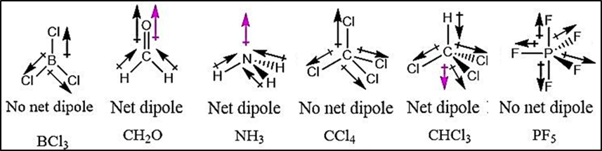 As a result of polarisation, the molecule possesses the dipole moment which is the product of the magnitude of the charge and the distance between the centres of positive and negative charge. The polarity of a covalent bond can be measured in terms of dipole moment which is defined asμ = q × rWhere μ is the dipole moment, q is the charge and 2d is the distance between the two charges. The dipole moment is a vector and the direction of the dipole moment vector points from the negative charge to positive charge. The unit for dipole moment is coulomb meter (C.m). It is usually expressed in Debye unit (1 Debye or D = 3.336 x 10-30 C.m). Diatomic molecules such as H2, O2, F2 etc. have zero dipole moment and are called non-polar molecules and molecules such as HF, HCl, CO, NO etc. have non-zero dipole moments and are called polar molecules. However, molecules having polar bonds will not necessarily have a dipole moment. Some examples are shown below.