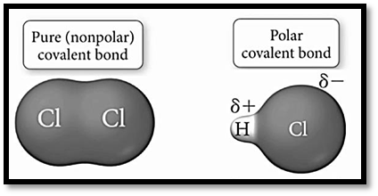 4.6.6.1 Partial ionic character in covalent bondIn case of non-polar covalent bond that is when a covalent bond is formed between two identical atoms (H2, O2, Cl2 etc.), the shared pair of electrons lies exactly in the middle of the nuclei of two atoms as both atoms have equal tendency to attract. But in case of polar covalent bond that is when a covalent bond is formed between atoms of different electronegativities such as HF, HCl etc., the atom with higher electronegativity will have greater tendency to attract the shared pair of electrons towards itself than the other atom resulting distortion of the cloud of shared electron pair.