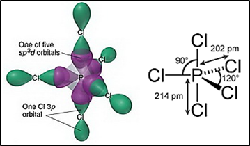 One 3s orbital, three 3p orbitals and one vacant 3d orbital (dz2) of P atom mixes to give five equivalent sp3d hybridised orbitals. The 3p orbitals of the five Cl atoms linearly overlap along the axis with the five sp3d hybridised orbitals of P (directed towards the five corners of a triagonal bipyramid) to form the five P-Cl σ-bonds.