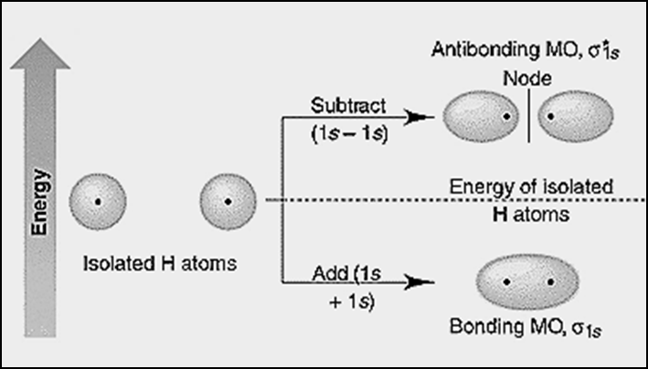 4.8.4 Postulates of Valence Bond TheoryWhen half filled orbitals of two atoms overlap, a covalent bond will be formed between them. The resultant overlapping orbital is occupied by the two electrons with opposite spins. The strength of a covalent bond depends upon the extent of overlap of atomic orbitals. Greater the overlap, larger is the energy released and stronger will be the bond formed. Each atomic orbital has a specific direction (except s-orbital which is spherical) and hence orbital overlap takes place in the direction that maximizes overlap. The presence of many unpaired electrons in the valence shell of an atom enables it to form multiple bonds with other atoms. The paired electrons present in the valence shell do not take participate in the formation of chemical bonds as per the valence bond theory.4.8.5 Limitations of Valence Bond TheoryThe theory only explains the formation of a covalent bond in which a shared pair of electrons comes from two bonding atoms but does not offer any explanation for coordinate bond where both the electrons are contributed by one of the bonded atoms. No insight is offered on the energies of the electrons. It does not give a quantitative interpretation of the thermodynamic or kinetic stabilities of coordination compounds and no explanation for the colour exhibited by them. There is no detailed information about the magnetic properties of the complexes. This theory fails to explain why O2 is paramagnetic (experimentally) as according to this theory, O2 should be diamagnetic.4.9 Molecular Orbital theoryLewis theory and valence bond theory qualitatively explains the chemical bonding and molecular structure but both the approaches are inadequate to describe some of the observed properties of molecules. Hund and Mulliken introduced a more advanced bonding theory called Molecular orbital theory (MOT). The key features of this theory are When atoms combines to form molecules, their individual atomic orbitals (AO) lose their identity and forms new orbitals called molecular orbitals (MO). The number of molecular orbitals formed is the same as the number of combining atomic orbitals. Half the number of molecular orbitals formed will have lower energy called bonding MO (BMO, represented as σ, π) than the corresponding atomic orbitals, while the remaining molecular orbitals will have higher energy called anti-bonding MO (ABMO, represented as σ*, π*). Sometimes, there is/are molecular orbital(s) having energies similar to their original atomic orbitals, they are called non-bonding MO (NBMO). The newly formed MO are filled with electrons according to Aufbau principle, Pauli’s exclusion principle and Hund’s rule as in the case of filling of electrons in atomic orbitals. The most effective combinations of atomic orbitals for the formation of molecular orbitals occur when the combining atomic orbitals have similar energies. Bond order gives the number of covalent bonds between the two combining atoms which can be calculated as, bond order (B.O.) = (Nb – Na)/2Where, Nb = Total number of electrons present in the BMO, Na = Total number of electrons present in the ABMO. A bond order of zero value indicates that the molecule doesn’t exist.4.9.1 Conditions for the combination of Atomic orbitals The combining atomic orbitals must have the same or nearly the same energy. The combining atomic orbitals must have the same symmetry about the molecular axis. The combining atomic orbitals must overlap to the maximum extent.4.9.2 Linear Combination of Atomic orbitalsMO can be visualised as being made up of appropriate AO provided by the atoms joined together in the molecule. A very simple, reasonable and satisfactory model is obtained if it is assumed that AO of constituent atoms combine in a linear additive fashion to form MO. It’s more of a superimposition method where constructive interference of two atomic wave function produces a BMO whereas destructive interference produces ABMO. The formation of the two molecular orbitals from two 1s orbitals is shown below.