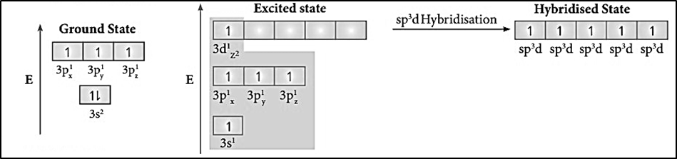 Hybridisation of Elements involving d orbitals The elements present in the third period contain d orbitals in addition to s and p orbitals. The energy of the 3d orbitals are comparable to the energy of the 3s and 3p orbitals as well as 4s and 4p orbitals. As a consequence, the hybridisation involving either 3s, 3p and 3d or 3d, 4s and 4p is possible. However, since the difference in energies of 3p and 4s orbitals is significant, no hybridisation involving 3p, 3d and 4s orbitals is possible.sp3d hydridisation (formation of PCl5): In PCl5, the central atom phosphorus is covalently bound to five chlorine atoms. One of the paired electrons in the 3s orbital of P is promoted to one of its vacant 3d orbital (dz2) in the excite state.