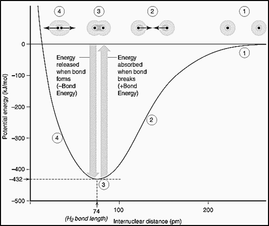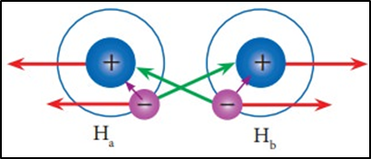 Consider a situation wherein two H atoms (Ha and Hb) are separated by infinite distance without any interaction between them and the potential energy of this system is arbitrarily taken as zero. As these two atoms approach each other, in addition to the electrostatic attractive force between the nucleus and its own electron (purple arrows), some new forces begins to operate. The new attractive forces (green arrows) arise between (i) nucleus of Ha and valence electron of Hb and (ii) nucleus of Hb and the valence electron of Ha. The new repulsive forces (red arrows) arise between (i) the nucleus of Ha and Hb and (ii) valence electrons of Ha and Hb.
