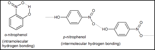 As this bond existed between partial charges, it is considered to be weak bond compared to ionic and covalent bonds. The physical state of a compound determines the strength of a hydrogen bond. H-bonding is very strong in the solid state but minimal in the gaseous state.4.5.1 Types of hydrogen bondBased on the type of interactions, it is classified into two types: intermolecular and intramolecular. Intermolecular hydrogen bond is formed between two different molecules of the same or different compounds whereas intramolecular hydrogen bond is formed when hydrogen atom is in between the two highly electronegative (F, O, N) atoms present within the same molecule. For example, in p-nitrophenol, the H atom is formed between two molecules whereas in o-nitrophenol, the H atom is in between the two O atoms within a same molecule.