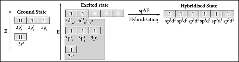 sp3d2 hydridisation (formation of SF6): In sulphur hexafluoride (SF6) the central atom sulphur extends its octet to undergo sp3d2 hybridisation and generates six sp3d2 hybrid orbitals which accounts for six equivalent S-F bonds. One electron each from 3s orbital and 3p orbital of sulphur is promoted to its two vacant 3d orbitals (dz2 and dx2-y2) in the excited state and mixes to give six equivalent sp3d2 hybridised orbitals. The six sp3d2 hybridised orbitals of sulphur overlaps linearly with 2p orbitals of six fluorine atoms to form the six S-F bonds in octahedral geometry.