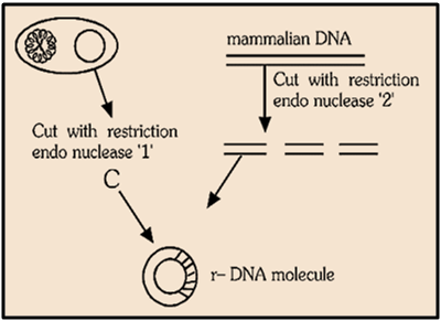 (1) Enzyme polymerase is not included(2) The mammalian DNA is shown double stranded(3) Only one fragment is inserted(4) Two different restriction enzymes are used119. Because of ……………production of a human protein in bacteria by genetic engineering is possible.(1) Bacterial cell can carry out the RNA splicing reactions(2) The mechanism of gene regulation is identical in humans and bacteria(3) The human chromosome can replicate in bacterial cell(4) The genetic code is universal120. If a recombinant DNA bearing gene for ampicillin resistance is transferred into E.Coli cells and the host cells are spread on agar plates containing ampicillin, then :-(1) both transformed and untransformed recipient cells will die(2) both transformed and untrasformed recipient cell will be grow(3) tranformed recipient cells will grow and untransformed recipient cells will die(4) transformed recipient cells will die and untransformed recipient cells will grow121. What is special in below sample of a portion of DNA strand giving the base sequence on the opposite strands. 5’______GAATTC_______3’3’______CTTAAG_______5’(1) Replication completed(2) Delection mutation(3) Start codon at the 5’ end(4) Palindromic sequence of base pairs122. In restriction endonuclease EcoRI "co" part stands for ?(1) Colon (2) Coelom(3) Coenzyme (4) Coli123. Agarose which is extracted from sea weeds is used in……..(1) Spectrophotometry (2) Tissue Culture(3) PCR (4) Gel electrophoresis124. Maximum number of existing transgenic animals is of :-(1) Fish (2) Mice(3) Cow (4) Pig125. In the development of plants resistant to…………… the process of RNA interference has been used.(1) Nematodes (2) Fungi(3) Viruses (4) Insects126. Find out themistakes in two of the statements .(A) The first transgenic buffalo, Rosie produced milk which was human alpha-lactalbumin enriched.(B) Restriction enzymes are used in isolation of DNA from other macro molecules.(C) Downstream processing is one of the steps of R-DNA technology.(D) Disarmed pathogen vectors are also used in transfer of R-DNA into the host.Which are the two statements having mistakes ?(1) Statements (A) and (B)(2) Statements (B) and (C)(3) Statements (C) and (D)(4) Statements (A) and (C)127. mRNA silencing has been used in producing transgenic plants resistant to……….(1) Bacterial blights (2) Bollworms(3) Nematodes (4) White rusts128. Bacillus thuringiensis forms insecticidal protein which…..(1) does not kill the carrier bacterium which is itself resistant to this toxin(2) binds with epithelial cells of midgut of the insect pest ultimately killing it(3) is coded by several genes including the gene cry(4) is activated by acid pH of the foregut of the insect pest129. ………………. techniques made it possible to genetically engineer living organisms?(1) Hybridization(2) Recombinant DNA techniques(3) X-ray diffraction(4) Heavier isotope labelling130. DNA polymerase used in PCR …….(1) It is isolated from a virus(2) It remains active at high temperature(3) It is used to ligate introduced DNA in recipient cells(4) It serves as a selectable marker131. Gene gun which is used for transformation, are made up of micro-particles coated with DNA to be bombarded with:-(1) Silicon or Platinum (2) Gold or Tungsten(3) Silver or platinum (4) Platinum or zinc132. The figure below is the diagrammatic representation of the E.Coli vector pBR 322. Which one of the given options correctly identifies its certain component(s)?