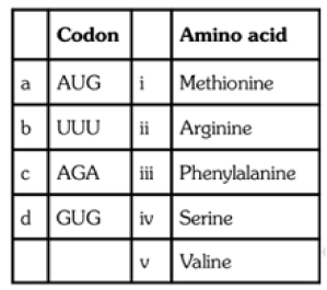Options :-(1) A-ii, B-v, C-iii, D-iv(2) A-v, B-iii, C-i, D-iv(3) A-ii, B-iv, C-iii, D-i(4) A-iii, B-ii, C-v, D-i235. Formation of protein on RNA-strand is called:-(1) Transcription (2) Translation (3) Replication (4) Transformation236. The experimental proof for semiconservative replication of DNA was first shown in a(1) Fungus (2) Bacterium(3) Plant (4) Virus237. Select the correct Match: (1) Alec Jeffreys – Streptococcus pneumoniae (2) Alfred Hershey and – TMV Martha Chase (3) Matthew Meselson – Pisum sativum and F. Stahl(4) Francois Jacob and – Lac operon Jacques Monod238. Select the correct Match :(1) Ribozyme - Nucleic acid(2) F2 × Recessive parent - Dihybrid cross(3) T.H. Morgan – Transduction(4) G. Mendel - Transformation239. AGGTATCGCAT is a sequence from the coding strand of a gene. What will be the corresponding sequence of the transcribed mRNA?(1) AGGUAUCGCAU(2) UGGTUTCGCAT(3) ACCUAUGCGAU(4) UCCAUAGCGUA240. All of the following are part of an operon except:-(1) an operator (2) structural genes (3) an enhancer (4) a promoter241. In which one of the following combinations (1–4) of the number of the chromosomes is the present day hexaploid wheat correctly represented Combination (1) (2) (3) (4)Monosomic 21 7 21 41Haploid 28 28 7 21Nullisomic 42 40 42 40Trisomic 43 42 43 43242. Differentiation of organs and tissues in a developing organism is association with:-(1) Developmental mutations (2) Differential expression of genes (3) Lethal mutations (4) Deletion of genes243. Molecular basis of organ differentiation depends on the modulation in transcription by: (1) RNA polymerase (2) Ribosome (3) Transcription factor (4) Anticodon244. The Okazaki fragments in DNA chain growth :(1) Result in transcription(2) Polymerize in the 3′-to-5′ direction and forms replication fork(3) Prove semi-conservative nature of DNA replication(4) Polymerize in the 5′-to-3′ direction and explain 3′-to-5′ DNA replication245. The two polynucleotide chains in DNA are: (1) Parallel (2) Discontinuous (3) Antiparallel (4) Semiconservative246. In the hexaploid wheat, the haploid (n) and basic (x) numbers of chromosomes are:-(1) n=7 and x=21 (2) n=21 and x=21(3) n=21 and x=14 (4) n=21 and x=7247. Which of the following nitrogen base is not found in DNA-(1) Thymine (2) Cytosine(3) Guanine (4) Uracil248. Polysome is formed by :-(1) A ribosome with several subunits(2) Ribosomes attached to each other in a linear arrangement(3) Several ribosomes attached to a single mRNA(4) Many ribosomes attached to a strand of endoplasmic reticulum249. Which one of the following pairs of nitrogenous bases of nucleic acids, is wrongly matched with the category mentioned against it ?(1) Guanine, Adenine – Purines(2) Adenine, Thymine – Purines(3) Thymine, Uracil – Pyrimidines(4) Uracil, Cytosine – Pyrimidines240. In the DNA molecule:-(1) the proportion of Adenine in relation to thymine varies with the organism (2) there are two strands which run antiparallel one in 5′ 3′ direction and other in 3′ 5′(3) the total amount of purine nucleotides and pyrimidine nucleotides is not always equal(4) there are two strands which run parallel in the 5′ 3′ direction251. ……….. of codons is correctly matched with their function or the signal for the particular amino acid ?(1) AUG, ACG – Start/Methionine (2) UUA, UCA –Leucine (3) GUU, GCU –Alanine (4) UAG, UGA – Stop252. ………bond is not related to nucleic acid: (1) H-bond (2) Ester bond (3) Glycosidic bond (4) Peptide Bond253. Haploids are more suitable for mutation studies than the diploids. This is because :-(1) haploids are more abundant in nature than diploids(2) All mutations, whether dominant or recessive are expressed in haploids(3) Haploids are reproductively more stable than diploids(4) Mutagens penetrate in haploids more effectively than in diploids254. What is not true for genetic code :-(1) It is unambiguous(2) A codon in mRNA is read in a non-contiguous fashion(3) It is nearly universal(4) It is degenerate255. Removal of introns and joining the exons in a defined order in a transcription unit is called:-(1) Capping (2) Splicing (3) Tailing (4) Transformation256. Semiconservative replication of DNA was first demonstrated in:-(1) Salmonella typhimurium (2) Drosophila melanogaster (3) Escherichia coli (4) Streptococcus pneumoniae257. Whose experiments cracked the DNA and discovered unequivocally that a genetic code is a "triplet”:-(1) Beadle and Tatum (2) Nirenberg and Mathaei (3) Hershey and Chase (4) Morgan and Sturtevant258. Point mutation involves:-(1) Deletion (2) Insertion (3) Change in sing (4) Morgan and Sturtevant259. Select the two correct statements out of the four (a-d) given below about lac operon(a) Glucose or galactose may bind with the repressor and inactivated(b) In the absence of lactose the repressor binds witht the operator region(c) The z-gene codes for permease(d) This was elucidated by Francois Jacob and Jacque MonodThe correct statements are :(1) (b) and (d) (2) (a) and (b)(3) (b) and (c) (4) (a) and (c)260. Satellite DNA is useful tool in: (1) Forensic science (2) Genetic engineering (3) Organ transplantation (4) Sex determination261. ′Nuclein′ term was coined by:-(1) Meischer and Crick (2) Altman (3) Griffith (4) Meischer262. Codons of proline amino acid are :-(1) CCU CCC CCA(2) CAU CAC CAA(3) GGU GGC GGA(4) AAU AAA AAC263. Which of the following is incorrect?(1) RNA polymerase II --> Heterogeneous nuclear RNA(2) RNA polymerase III --> t-RNA, Sn-RNA, 5 S-rRNA(3) RNA polymerase I --> r-RNA(4) RNA polymerase I --> t-RNA, Sn-RNA, 5 S-rRNA264. Choose the correct option regarding above diagram:-