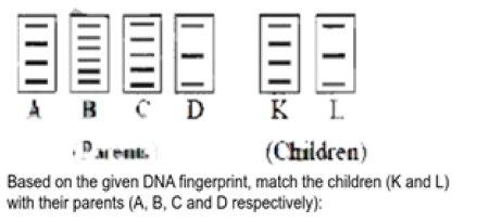 On the basis of given DNA fingerprint, match the childrens (K & L) with their respective parent (A, B, C and D):-(1) K-A, L-A (2) K-A, L-D (3) K-A, L-C (4) K-B, L-A195. Point mutation means?(1) Change in single base pair in DNA(2) Change in single base pair in RNA(3) Change in double base pair in DNA(4) Change in double base pair in RNA196. Genetic material is …….in most of the plant viruses.-(1) ssDNA (2) ssRNA(3) dsRNA (4) ssRNA + ssDNA197. Biological name of wheat is:-(1) Triticum aestivum (2) Triticum triticale(3) Triticum sativum (4) Triticum tuberosum198. DNA as the genetic material was finallyproved from the experiments of: (1) Hershey and Chase (2) Avery, Mcleod and McCarty (3) Hargobind Khorana (4) Griff199. DNA fragments are:(1) Negatively charged(2) Neutral(3) Either positively or negatively charge depending on their size(4) Positively charged200. If there are 999 bases in an RNA that codes for a protein with 333 amino acids, and the base at position 901 is deleted such that the length of the RNA becomes 998 bases, how many codons will be altered?(1) 11 (2) 33(3) 333 (4) 1201. Which one of the following pairs of terms/names mean one and the same thing(1) Gene pool – genome(2) Codon – gene(3) Cistron – triplet(4) DNA Fingerprinting - DNA profiling202. Which step does not involve in DNA finger printing(1) Southern blotting(2) Gel electrophoresis(3) Restriction enzyme digestion(4) Northern blotting203. ……… is the technique of transferring DNA fragment separated on Agarose gel to a synthetic membrane such as nitrocellulose (1) Northern blotting (2) Southern blotting(3) Western blotting (4) Dot blotting204. Western blotting is used for the identification of:-(1) DNA (2) RNA (3) Protein (4) All the above205. Techniques whichare used in analysing restriction fragment length polymorphism (RFLP) :-(a) Electrophoresis(b) Electroporation(c) Methylation(d) Restriction digestion(1) ′a′ and ′c′ (2) ′c′ and ′d′(3) ′a′ and ′d′ (4) ′b′ and ′d′206. The approximate number of genes contained in the humangenome (1) 40,000 (2) 30,000(3) 80,000 (4) 1,00,000207. The transfer of protein from electrophoretic gel to nitrocellulose membrane is known as:-(1) transferase (2) northern blotting(3) western blotting(4) southern blotting208. ………………. is not associated with HGP–(1) Bioinformatics(2) Cloning vectors BAC & YAC(3) Automated DNA sequencers(4) VNTR209. In density gradient centrifugation, the bulk DNA forms_____ while satellite DNA forms________.(1) Major peak; Minor peak(2) Minor peak; Major peak(3) Major peak; Major peak(4) Minor peak; Minor peak210. Which step is not correct in DNA finger printing–(1) Isolation of DNA(2) Digestion of DNA by DNA ligase enzyme(3) Separation of DNA by electrophoresis(4) Hybridisation using labelled VNTR probe211. DNA fingerprinting method is very useful for -(1) DNA tests for identity &relationships(2) Forensic studies(3) Polymorphism(4) All of the above212. Which antibiotic inhibits interaction between Trna and mRNA during bacterial protein synthesis?(1) Erythromycin (2) Neomycin(3) Streptomycin (4) Tetracycline213. Amino acid sequence, in protein synthesis is decided by the sequence of(1) tRNA (2) mRNA(3) cDNA (4) rRNA214. One gene-one enzyme hypothesis was postulated by (1) R. Franklin (2) Hershey and Chase (3) A.Garrod (4) Beadle and Tatum215. One turn of the helix in a B-form DNA is approximately(1) 20 nm (2) 0.34 nm(3) 3.4 nm (4) 2 nm216. Antiparallel strands of a DNA molecule means that(1) one strand turns anti-clockwise(2) the phosphate groups of two DNA strands, at their ends, share the same position(3) the phosphate groups at the start of two DNA strands are in opposite position (pole) (4) one strand turns clockwise217. Cri-du-chat syndrome in humans is caused by the(1) Fertilization of an XX egg by a normal Y-bearing sperm(2) Loss of half of the short arm of chromosome 5(3) Loss of half of the long arm of chromosome 5(4) Trisomy of 21stchromosome218. Triticale, the first man-made cereal crop, has been obtained by crossing wheat with –(1) Rye (2) Pearl millet(3) Sugarcane (4) Barley219. During protein synthesis in an organism, at one point the process comes to a halt. Select the group of the three codons from the following from which any one of the three could bring about this halt –(1) UUU, UCC, UAU (2) UUC, IIA, UAC(3) UAG, UGA, UAA (4) UUG, UCA, UCG220. Thymine is –(1) 5–Methyl uracil (2) 4–Methyl uracil(3) 3–Methyl uracil (4) 1–Methyl uracil221. During DNA replication, Okazaki fragments are used to elongate:(1) The lagging strand towards replication fork.(2) The leading strand away from replication fork.(3) The lagging strand away from the replication fork.(4) The leading strand towards replication fork.222. Which of the following RNAs should be most abundant in animal cell?(1) t-RNA (2) m-RNA(3) mi-RNA (4) r-RNA223. What is the criterion for DN A fragments movement on Agarose gel during gel electrophoresis ?(1) The smaller the fragment size, the farther it moves(2) Positively charged fragments move to farther end(3) Negatively charged fragments do not move(4) The larger the fragment size, the farther it moves224. DNA replication in bacteria occurs:(1) Within nucleolus(2) Prior to fission(3) Just before transcription(4) During S phase225. Spliceosomes are not found in cells of;(1) Fungi (2) Animals(3) Bacteria (4) Plants226. The association of histone H1 with a nucleosome indicates:(1) DNA replication is occurring.(2) The DNA is condensed into a Chromatin Fibre.(3) The DNA double helix is exposed.(4) Transcription is occurring.227. The process of formation of RNA from DNA is known as(1) Transcription(2) Translation(3) Replication(4) Transformation228. If base sequence in m-RNA is 5′ UAC GUA CGU ACG UAC GUA CGU ACG 3′ then what will be sequence of template strand?(1) 5′ CGT ACG TAC GTA CGT ACG TAC GTA 3′(2) 5′ TAC GTA CGT ACG TAC GTA CGT ACG 3′(3) 5′ ATG CAT GCA TGC