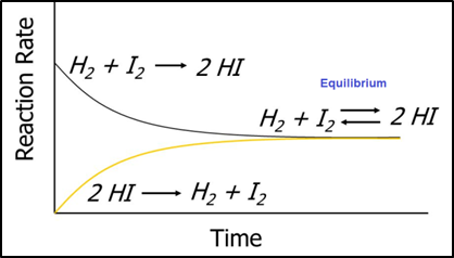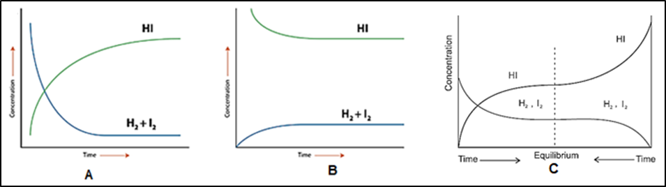 H2 (g) + I2 (g) ⇌ 2HI (g)Chemical equilibrium can be attained whether the reaction begins with all reactants and no products or all products and no reactants, or some of both. In the reaction depicted by the graph (A), the reaction begins with only H2 and I2 present and no HI initially. As the reaction proceeds toward equilibrium, the concentrations of the H2 and I2 gradually decrease, while the concentration of the HI gradually increases. When the curve levels out, equilibrium has been reached. At equilibrium, concentrations of all substances are constant. In graph (B), the process begins with only HI and no H2 or I2. In this case, the concentration of HI gradually decreases while the concentrations of H2 and I2 gradually increase until equilibrium is again reached. In both cases, the relative position of equilibrium is the same, as shown by the relative concentrations of reactants and products. The combined effect of (A) and (B) are shown in graph (C). The concentration of HI at equilibrium is significantly higher than the concentrations of H2 and I2 whether the reaction began with all reactants or all products. The position of equilibrium is a property of the particular reversible reaction and does not depend upon how equilibrium was achieved.