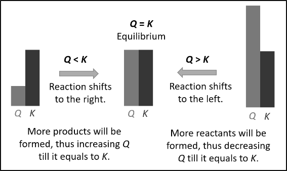 7.5.2 Predicting the Direction of a reactionThe equilibrium constant helps in predicting the direction in which a given reaction will proceed at any stage. For this purpose, we need to calculate the reaction quotient Q (Qc with molar concentrations and Qp with partial pressures) which is defined in the same way as the equilibrium constant Kc except that the concentrations terms in Qc or partial pressure terms in Qp may or may not be equilibrium values.For a general reaction:aA + bB ⇌ cC + dDAs the reaction proceeds, there is a continuous change in the concentration of reactants and products and also the Q value until the reaction reaches the equilibrium. At equilibrium Q is equal to K at a particular temperature. Once the equilibrium is attained, there is no change in the Q value. By knowing the Q value, we can predict the direction of the reaction by comparing it with K.If Q = K, the reaction is already at equilibrium, and no further change in the composition of the system will occur unless the conditions are changed.If Q > K, the reaction will proceed in the reverse direction i.e., formation of reactants.If Q < K, the reaction will proceed in the forward direction i.e., formation of products.