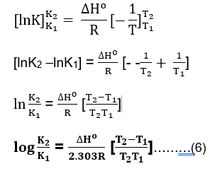 RT2 ………(5)Equation (5) is known as differential form of van’t Hoff equation. If the enthalpy change of reaction is assumed to be constant with temperature, the definite integral of this differential equation (5) between absolute temperatures T1 and T2 is given by∫k2