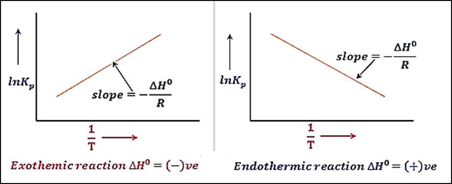 R……….(4)ΔHº is the enthalpy change and R is the universal gas constant. Therefore, a plot of the natural logarithm of the equilibrium constant versus the reciprocal of temperature gives a straight line. The slope of the line is equal to ±ΔHº/R (depending on exothermic or endothermic reaction) and the intercept is equal to ΔSº/R.