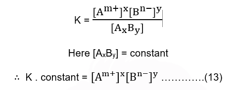 The salt AxBy dissociates to produce x number of cations Am+ and y number of anions Bn-. If the molar solubility of AxBy is S, then it can be seen from the stoichiometry of the salt that[Am+] = xS and [Bn-] = ySEquation (13) can be written as