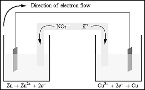When the switch is in ‘on’ position following processes start. Zn atoms from the zinc electrode are oxidized to Zn2+. The electrode at which oxidation occurs is called the anode. The zinc anode gradually diminishes as the cell operates due to the loss of zinc metal. The concentration of Zn2+ ion in the left half-cell increases. Because of the production of electrons at the anode, it is labelled as the negative electrode.Zn(s) →Zn2+ (aq) + 2e- The electrons that are generated at the zinc anode travel through the external wire and register a reading on the ammeter. They continue to the copper electrode. Electrons enter the Cu electrode where they combine with the Cu2+ ions in the solution, reducing them to Cu metal. Cu2+ (aq) + 2e- → Cu(s) The electrode at which reduction occurs is called the cathode which gradually increases in mass because of the production of Cu metal. The concentration of Cu2+ ions in the half-cell solution decreases. The cathode is the positive electrode. The two half-reactions can again be summed to provide the overall redox reaction occurring in the voltaic cell.Zn(s) + Cu2+ (aq) → Zn2+ (aq) + Cu(s)8.9.1 Role of Salt BridgeThe electrons move through the wire leaving the unbalanced positive charge (Zn2+) in the left compartment. In order to maintain neutrality, the negatively charged ions (NO3-) in the salt bridge will migrate into the anodic half-cell. A similar (but reversed) situation is found in the cathodic cell, where Cu2+ ions are being consumed, and therefore electroneutrality is maintained by the migration of K+ ions from the salt bridge into this half-cell.
