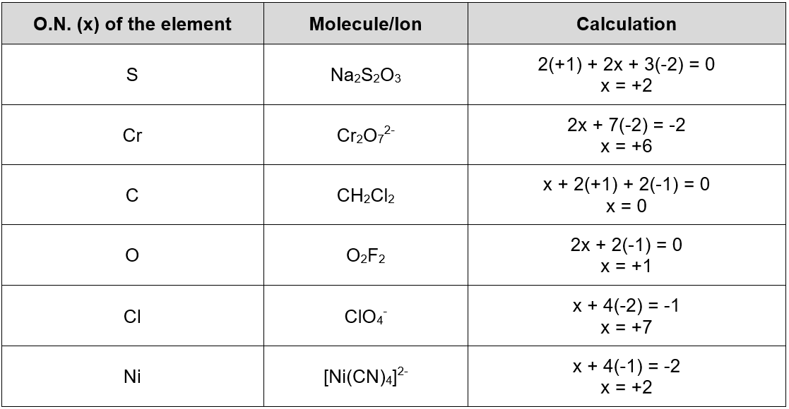We can write the two half reactions, one involving the loss of electrons and the other involving the gain of electrons as2Na → 2Na+ + 2e- ………….(oxidation half reaction)S + 2e- → S2- …………(reduction half reaction)These half reactions explicitly show involvement of electrons. Sum of the half reactions gives the overall reaction.8.4 Oxidation numberOxidation and reduction can further be explained by the knowledge of ‘Oxidation number’. Oxidation number is defined as the imaginary charge appears on the atom in a molecule or ion, when electrons are assigned in accordance with some arbitrary rules on the basis that electron pair in a covalent bond belongs entirely to more electronegative element. A term that is often used interchangeably with oxidation number is ‘oxidation state’. If two or more than two atoms of an element are present in the molecule or ion (such as Na2S2O3, Cr2O72- etc.), the oxidation number of the atom of that element will be average of the oxidation number of all the atoms of that element. When the atom loses electrons its oxidation state increases and when the atom gains electrons its oxidation state decreases. The term oxidation number represents the positive or negative character of the atom in a compound. Electrons shared by two like atoms are divided equally between the two atoms. Electrons shared between two unlike atoms are assigned to the more electronegative atom of them.The rules for calculation of oxidation number as mentioned before are as followsi) The oxidation number (O.N.) of an element in a free atomic state (Na, H, Cl, P etc.) or in its poly-atomic state (graphite, H2, Cl2, P4, etc.) is always zero. ii) For a monatomic ion, the oxidation state is equal to the net charge on the ion. Example: The oxidation number of sodium in Na+ is +1. The oxidation number of chlorine in Cl- is -1.iii) The algebraic sum of oxidation states of all atoms in a molecule is equal to zero, while in ions, it is equal to the net charge on the ion.Example: In H2SO4, [2 × (O.N. of H) + 1 x (O.N. of S) + 4 x (O.N. of O)] = 0 .In SO42-, [1 x (O.N. of S) + 4 x (O.N. of O)] = -2.iv) Hydrogen has an oxidation number of +1 in all its compounds except in metal hydrides where it has -1 value.Example: Oxidation number of H in hydrogen chloride (HCl), H2O, etc. is +1. Oxidation number of H in metal hydrides such as LiH, CaH2, KH, etc. is -1.v) The oxidation state of oxygen in most compounds is -2. Exceptions are peroxides (O.N. is -1), super oxides (O.N. is -1/2) and compounds with fluorine (O.N. is positive as O is less electronegative than F).vi) Fluorine has an oxidation state of -1 in all its compounds as F is the most electronegative element. Other halogens (Cl, Br, and I) also have an oxidation number of -1 when they occur as halide ions (Cl-, Br-, I-) in their compounds. When halogens are combined with oxygen, for example in oxoacids and oxoanions, they have positive oxidation numbers (as halogens are less electronegative that oxygen).Example: In HI, KCl, MgBr2; O.N. of halogens is -1 as they are present as halide ions. In both oxoacid HClO4 (perchloric acid) and oxoanion ClO4- (chlorate ion), the O.N. of chlorine is +7.vii) Alkali metals of group 1 (Li, Na, K etc.) have an oxidation state of +1 and alkaline earth metals of group 2 (Be, Mg, Ca etc.) have an oxidation state of +2 in all their compounds. vii) In a coordination compounds (involving co-ordination by ligands), it is more convenient to use oxidation number of ligands as a whole instead of the oxidation number of individual atoms. For example, in [Ni(CN)4]2- anion the O.N. of CN- ion is -1. Here CN- as a whole is considered and not of individual C or N. Here, nickel has O.N. +2.On the basis of the above rules, calculation of oxidation number of a particular given atom in some molecules and ions are shown below.