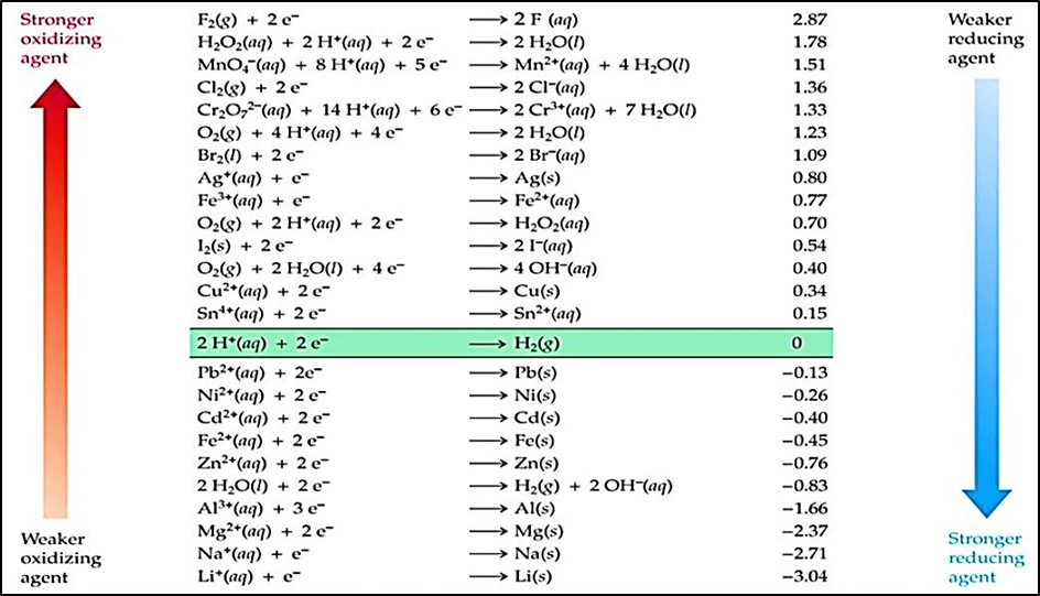 8.9.2 Electrochemical series The flow of current is possible only if there is a potential difference between the two electrodes. The potential associated with each electrode is known as electrode potential. If the concentration of each species taking part in the electrode reaction is unity (if any gas appears in the electrode reaction, it is confined to 1 atm) and the reaction is carried out at 298 K, then the potential of each electrode is said to be the Standard Electrode Potential (Eº). By convention, the standard electrode potential of hydrogen electrode (standard hydrogen electrode or SHE) is 0.00 volts. Standard electrode potential is obtained by measuring the voltage when the half-cell is connected to the standard hydrogen electrode under standard conditions.Electrochemical series (also called activity series), is a list that describes the arrangement of elements in the order of their increasing electrode potential values. The series has been established by measuring the potential of various electrodes versus standard hydrogen electrode (SHE). The electrode potential value for each electrode process is a measure of the relative tendency of the active species in the process to remain in the oxidised/reduced form. A negative Eº means that the redox couple is a stronger reducing agent than the H+/H2 couple. A positive Eº means that the redox couple is a weaker reducing agent than the H+/H2 couple. The standard electrode potentials are very important and we can get a lot of other useful information from them. The values of standard electrode potentials for some electrode processes based on reduction reactions (electrochemical series) are shown below.