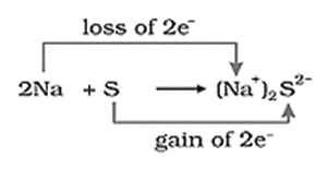 As an example, we will take the reaction between sodium metal and sulfur producing sodium sulfide.2Na + S → Na2SThe reaction can be written with the charges on the species as