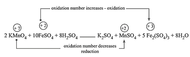 Step IV: The coefficient should be applied to the formulas in the equation to balance both atoms and charge. So, a 3 is placed in front of the CO and CO2. A 2 is placed in front of Fe on the right side of the equation. Fe2O3 does not require a coefficient.Fe2O3 (s) + 3CO (g) → 2Fe (s) + 3CO2 (g)The equation is now balanced.Note: (i) In the reactions taking place in acidic medium, balance the O atom by adding the required number of H2O molecules to the side deficient in O atoms. Then balance the H atoms by adding H+ to the side deficient in H atoms.(ii) For the reaction in a basic medium, first balance the atoms as is done in acidic medium. Then for each H+ ion, add an equal number of HO– ions to both sides of the equation. Where H+ and HO– appear on the same side of the equation, combine these two ions to give H2O.ii. Ion-electron method / Half reaction methodThis method is mainly used for ionic redox reactions. Let us consider the following example to show the steps followed in this method. It is the reaction between potassium permanganate and ferrous sulphate in acidic medium.KMnO4 + FeSO4 + H2SO4 → MnSO4 + Fe2(SO4)3 + K2SO4 + H2OStep I: Write the ionic form of this reaction and assign oxidation numbers to the atoms of all the elements in the equation and write above the atoms.
