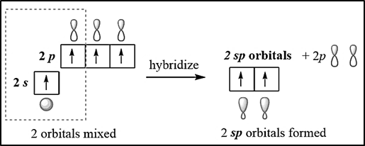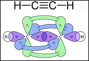 sp hydridisation in C2H2: In ethyne or acetylene molecule, both the carbon atoms undergo sp-hybridisation leaving two unhybridised orbitals. One sp hybrid orbital of one carbon atom overlaps axially with sp hybrid orbital of the other carbon atom to form C-C σ bond, while the other sp hybridised orbital of each carbon atom overlaps axially with the half-filled 1s orbital of hydrogen atoms forming σ bonds. Each of the two unhybridised p orbitals of both the carbon atoms overlap sidewise to form two π bonds between the carbon atoms. In this way, the triple bond between the two carbon atoms is made up of one σ bond (using hybrid orbitals) and two π bonds (using pure p orbitals). π bonds are always formed with unhybridised pure p orbitals.