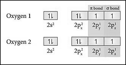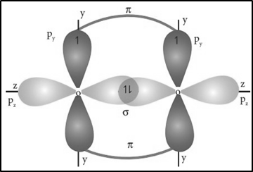 When the half filled pz orbitals of two oxygen overlaps along the z-axis (consider z axis as molecular axis), a σ-covalent bond is formed between them. Other two half filled py orbitals of two oxygen atoms overlap laterally (sideways) to form a π-covalent bond between the oxygen atoms. Thus, in oxygen molecule, two oxygen atoms are connected by two covalent bonds (double bond). The other two pair of electrons present in the 2s and 2px orbital do not involve in bonding and remains as lone pairs on the respective oxygen atom.