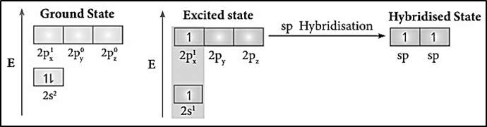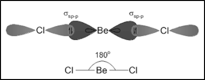 sp hydridisation: This type of hybridisation involves the mixing of one s and one p orbital resulting in the formation of two equivalent sp hybrid orbitals. For example, in BeCl2 both the Be-Cl bonds are equivalent and it was observed that the molecule is linear. One of the paired electrons in the 2s orbital gets excited to 2p orbital. The 2s and one of the 2p orbitals hybridise to produce two equivalent sp hybridised orbitals having 50% s-character and 50% p-character. Each of the sp hybridized orbitals linearly (180o) overlap with 3p orbital of the Cl to form a covalent bond between Be and Cl.