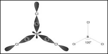 sp2 hydridisation: This type of hybridisation involves the mixing of one s and two p-orbitals in order to form three equivalent sp2 hybridised orbitals. For example, in BCl3 all the B-Cl bonds are equivalent and it was observed that the molecule is planar