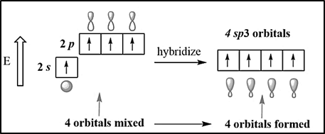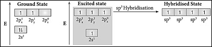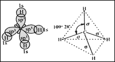 The 2s orbital and three p orbitals in the valence shell hybridise to generate four equivalent sp3 orbitals and overlap with the 1s orbitals of four hydrogen atoms. These four sp3 orbitals are directed towards the four corners of the tetrahedron and the angle between sp3 hybrid orbitals is 109°28’.