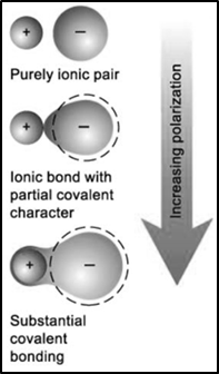 4.6.6.2 Partial covalent character in ionic bondIn an ionic compound, there is an electrostatic attractive force between the cation and anion. The positively charged cation attracts the valence electrons of anion while repelling the nucleus resulting a distortion in the electron cloud of the anion and its electron density drifts towards the cation, which results in some sharing of the valence electrons between these ions. Thus, a partial covalent character is developed between them. This phenomenon is called polarisation. The ability of a cation to polarise an anion is called its polarising ability and the tendency of an anion to get polarised is called its polarisability. The extent of polarisation in an ionic compound is given by the Fajan’s rules.
