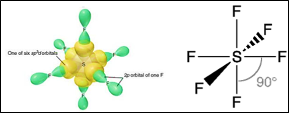 sp3d2 hydridisation (formation of SF6): In sulphur hexafluoride (SF6) the central atom sulphur extends its octet to undergo sp3d2 hybridisation and generates six sp3d2 hybrid orbitals which accounts for six equivalent S-F bonds. One electron each from 3s orbital and 3p orbital of sulphur is promoted to its two vacant 3d orbitals (dz2 and dx2-y2) in the excited state and mixes to give six equivalent sp3d2 hybridised orbitals. The six sp3d2 hybridised orbitals of sulphur overlaps linearly with 2p orbitals of six fluorine atoms to form the six S-F bonds in octahedral geometry.
