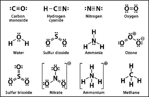 V. Verify whether all the atoms satisfy the octet rule (for hydrogen duet). If not, use the lone pairs of electrons to form additional bond to satisfy the octet rule. In case of water, oxygen atom has octet and the hydrogen atoms have duets, hence there is no need for shifting the lone pairs.Lewis dot structures of some molecules and polyatomic ions are shown below as examples.