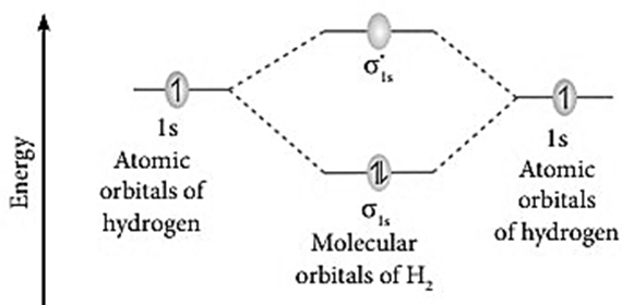 4.8.4 Postulates of Valence Bond TheoryWhen half filled orbitals of two atoms overlap, a covalent bond will be formed between them. The resultant overlapping orbital is occupied by the two electrons with opposite spins. The strength of a covalent bond depends upon the extent of overlap of atomic orbitals. Greater the overlap, larger is the energy released and stronger will be the bond formed. Each atomic orbital has a specific direction (except s-orbital which is spherical) and hence orbital overlap takes place in the direction that maximizes overlap. The presence of many unpaired electrons in the valence shell of an atom enables it to form multiple bonds with other atoms. The paired electrons present in the valence shell do not take participate in the formation of chemical bonds as per the valence bond theory.4.8.5 Limitations of Valence Bond TheoryThe theory only explains the formation of a covalent bond in which a shared pair of electrons comes from two bonding atoms but does not offer any explanation for coordinate bond where both the electrons are contributed by one of the bonded atoms. No insight is offered on the energies of the electrons. It does not give a quantitative interpretation of the thermodynamic or kinetic stabilities of coordination compounds and no explanation for the colour exhibited by them. There is no detailed information about the magnetic properties of the complexes. This theory fails to explain why O2 is paramagnetic (experimentally) as according to this theory, O2 should be diamagnetic.4.9 Molecular Orbital theoryLewis theory and valence bond theory qualitatively explains the chemical bonding and molecular structure but both the approaches are inadequate to describe some of the observed properties of molecules. Hund and Mulliken introduced a more advanced bonding theory called Molecular orbital theory (MOT). The key features of this theory are When atoms combines to form molecules, their individual atomic orbitals (AO) lose their identity and forms new orbitals called molecular orbitals (MO). The number of molecular orbitals formed is the same as the number of combining atomic orbitals. Half the number of molecular orbitals formed will have lower energy called bonding MO (BMO, represented as σ, π) than the corresponding atomic orbitals, while the remaining molecular orbitals will have higher energy called anti-bonding MO (ABMO, represented as σ*, π*). Sometimes, there is/are molecular orbital(s) having energies similar to their original atomic orbitals, they are called non-bonding MO (NBMO). The newly formed MO are filled with electrons according to Aufbau principle, Pauli’s exclusion principle and Hund’s rule as in the case of filling of electrons in atomic orbitals. The most effective combinations of atomic orbitals for the formation of molecular orbitals occur when the combining atomic orbitals have similar energies. Bond order gives the number of covalent bonds between the two combining atoms which can be calculated as, bond order (B.O.) = (Nb – Na)/2Where, Nb = Total number of electrons present in the BMO, Na = Total number of electrons present in the ABMO. A bond order of zero value indicates that the molecule doesn’t exist.4.9.1 Conditions for the combination of Atomic orbitals The combining atomic orbitals must have the same or nearly the same energy. The combining atomic orbitals must have the same symmetry about the molecular axis. The combining atomic orbitals must overlap to the maximum extent.4.9.2 Linear Combination of Atomic orbitalsMO can be visualised as being made up of appropriate AO provided by the atoms joined together in the molecule. A very simple, reasonable and satisfactory model is obtained if it is assumed that AO of constituent atoms combine in a linear additive fashion to form MO. It’s more of a superimposition method where constructive interference of two atomic wave function produces a BMO whereas destructive interference produces ABMO. The formation of the two molecular orbitals from two 1s orbitals is shown below.