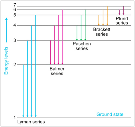 Transitions of the electron in the H atom (all series of transitions are shown)